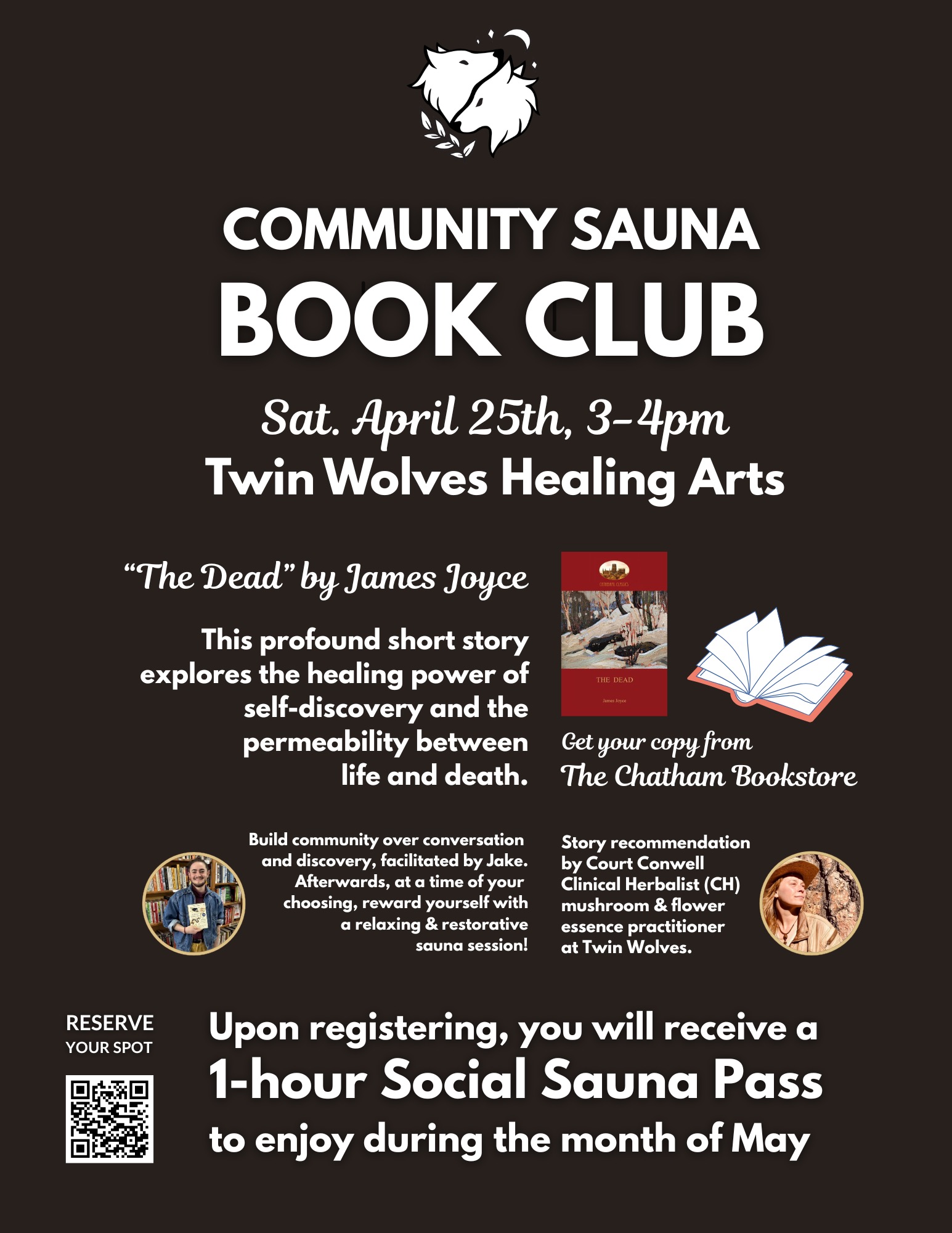 Join us at Twin Wolves for our monthly book club led by Jake and Willow—each registration includes a 1hr-Social Sauna Pass for you to enjoy at your leisure throughout the month of May.
